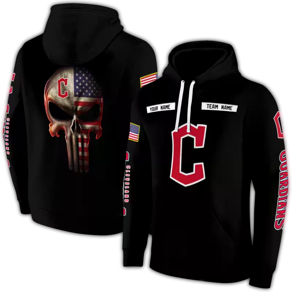 Show your unwavering support for the Cleveland Guardians with our Personalized Cleveland Guardians Punisher Skull All Over Print Hoodie. Designed for fans who love to showcase their team spirit, this hoodie is perfect for casual outings, game days, or simply lounging around. Its unique all-over print brings an edgy style, making it a standout piece in any wardrobe.