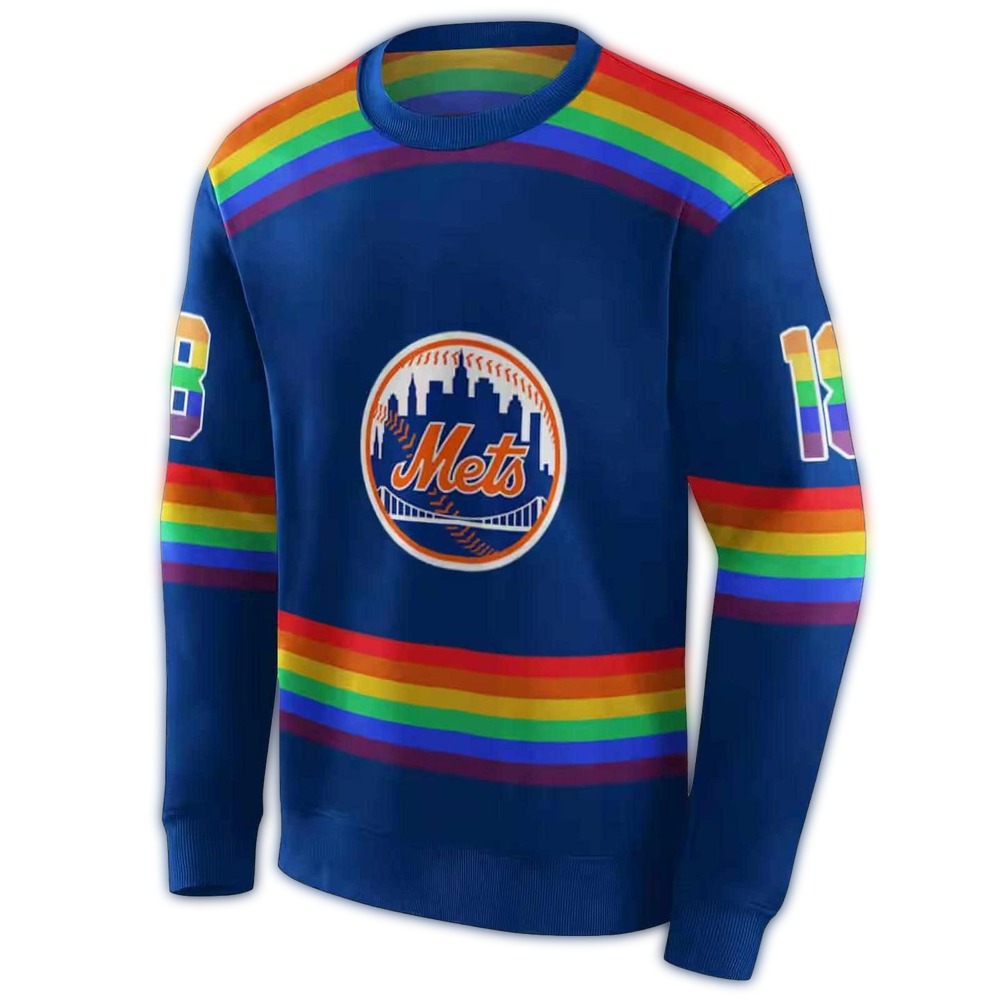 Unleash your love for the New York Mets with our Personalized New York Mets Rainbow Stripes All-over Print Sweatshirt! Perfect for fans and fashion enthusiasts alike, this vibrant sweatshirt is ideal for casual outings, game days, or simply lounging at home. Its unique design and cozy fit make it a standout piece in any streetwear collection.
