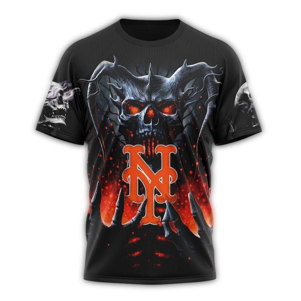 Introducing the Personalized New York Mets Skull All Over Print T-Shirt, a perfect blend of team spirit and edgy style! Designed for devoted Mets fans and fashion-forward individuals alike, this shirt is ideal for game days, casual outings, or adding a unique touch to your everyday wardrobe. Stand out from the crowd with this graphic tee that showcases your love for the team in a fresh, artistic way.