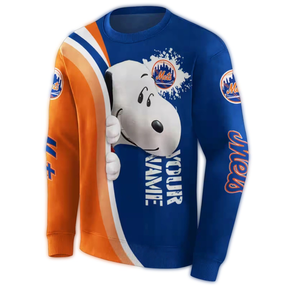 Embrace your love for the New York Mets with our Personalized New York Mets Peeking Snoopy and Woodstock All Over Print Sweatshirt. This stylish and cozy piece is perfect for any fan looking to showcase their team spirit while staying comfortable. Ideal for casual outings, lounging at home, or cheering from the stands, this sweatshirt combines a playful design with everyday wearability.