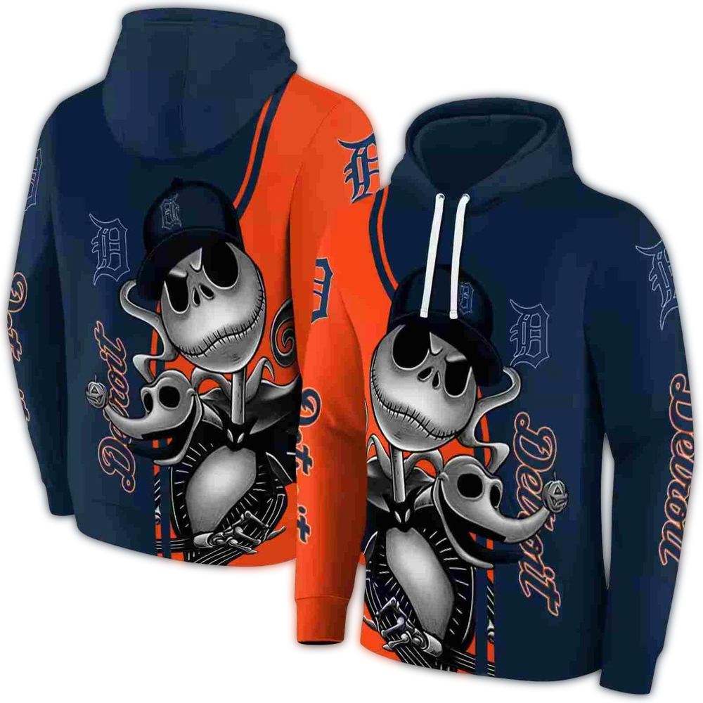 Introducing the Detroit Tigers Jack Skellington All Over Print Hoodie, a must-have for fans of both the iconic baseball team and the whimsical world of Tim Burton. This unique hoodie is perfect for anyone looking to showcase their love for the Tigers while staying cozy and stylish. Ideal for casual outings, game days, or simply lounging at home, this hoodie brings a playful yet trendy vibe to your wardrobe.