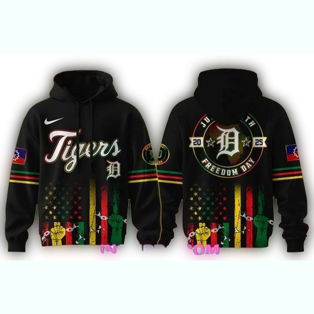 Celebrate your love for the Detroit Tigers with our Juneteenth Day All Over Print Hoodie, designed for fans who appreciate style and comfort. This uniquely crafted hoodie is perfect for casual outings, game days, or simply lounging around while showcasing your team spirit. Its eye-catching all-over print makes it a standout piece in any wardrobe.