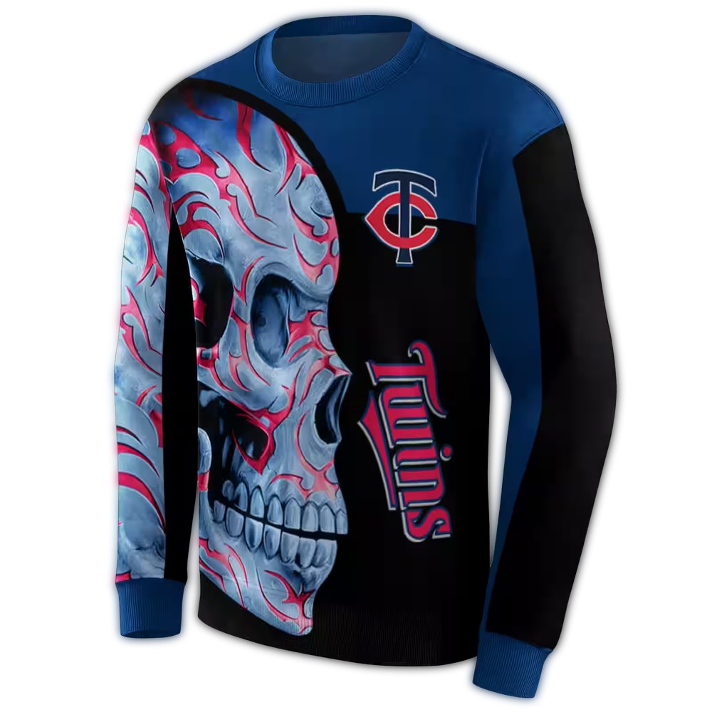 Introducing the Minnesota Twins Skull Motif AOP Sweatshirt, a perfect blend of street style and sports enthusiasm. Ideal for die-hard fans and fashion-forward individuals alike, this sweatshirt is perfect for casual outings, game days, or simply lounging at home. Its unique skull motif showcases your team spirit with an edgy twist, making it a standout piece in any wardrobe.